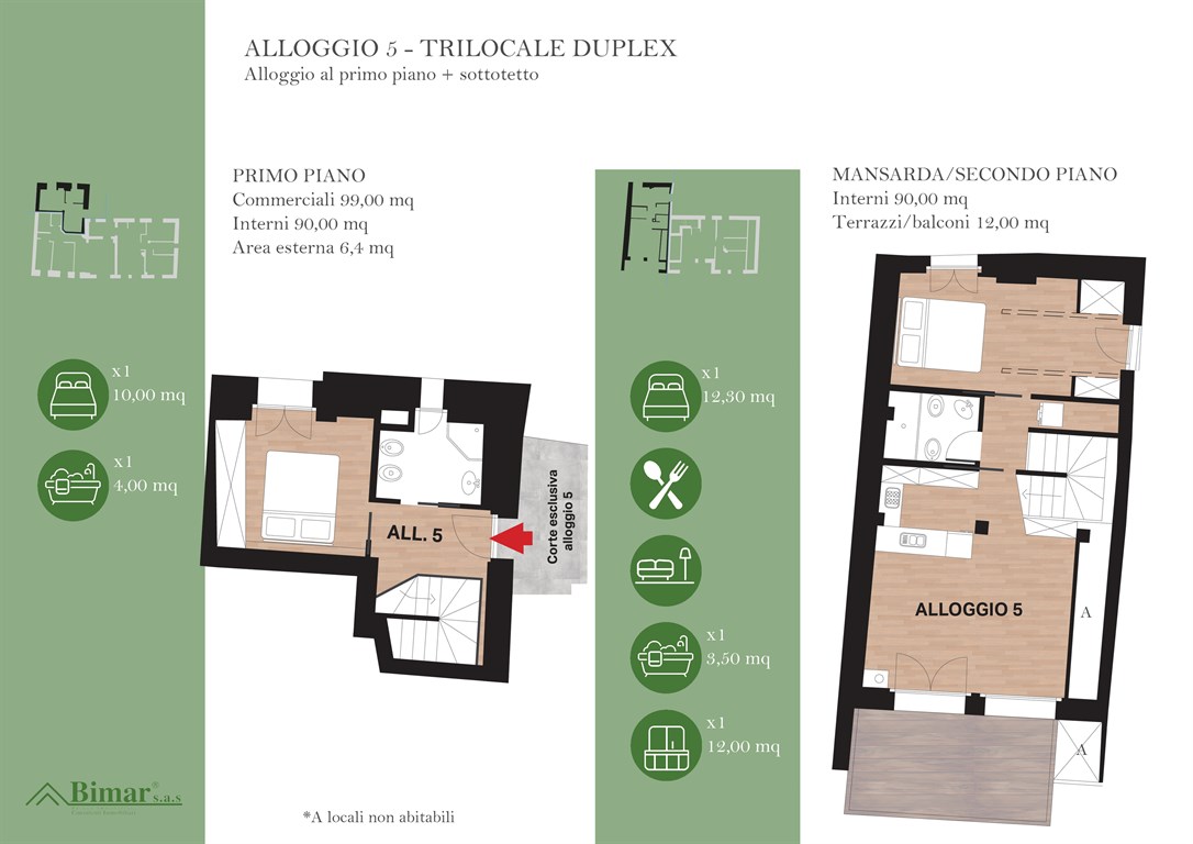 L’alloggio 5, trilocale duplex posto al piano primo e sottotetto della CASA B, qui proposto sarà composto da: ingresso al piano primo, camera da letto matrimoniale e un bagno; al piano secondo/sottotetto ampio soggiorno (con camino) cucina su soggiorno, camera da letto matrimoniale, un secondo bagno oltre a ripostiglio. I soffitti in legno a vista caratterizzano tutti gli ambienti, riproponendo così il fascino delle strutture tradizionali in legno tipiche delle grange. Completa l’alloggio un terrazzo esclusivo antistante il soggiorno di 12 mq. di superficie e un’area esclusiva di 7 mq. sul retro della CASA B. Modifiche al lay out e finiture personalizzabili in corso d’opera senza costi aggiuntivi, compatibilmente all’avanzamento dei lavori.