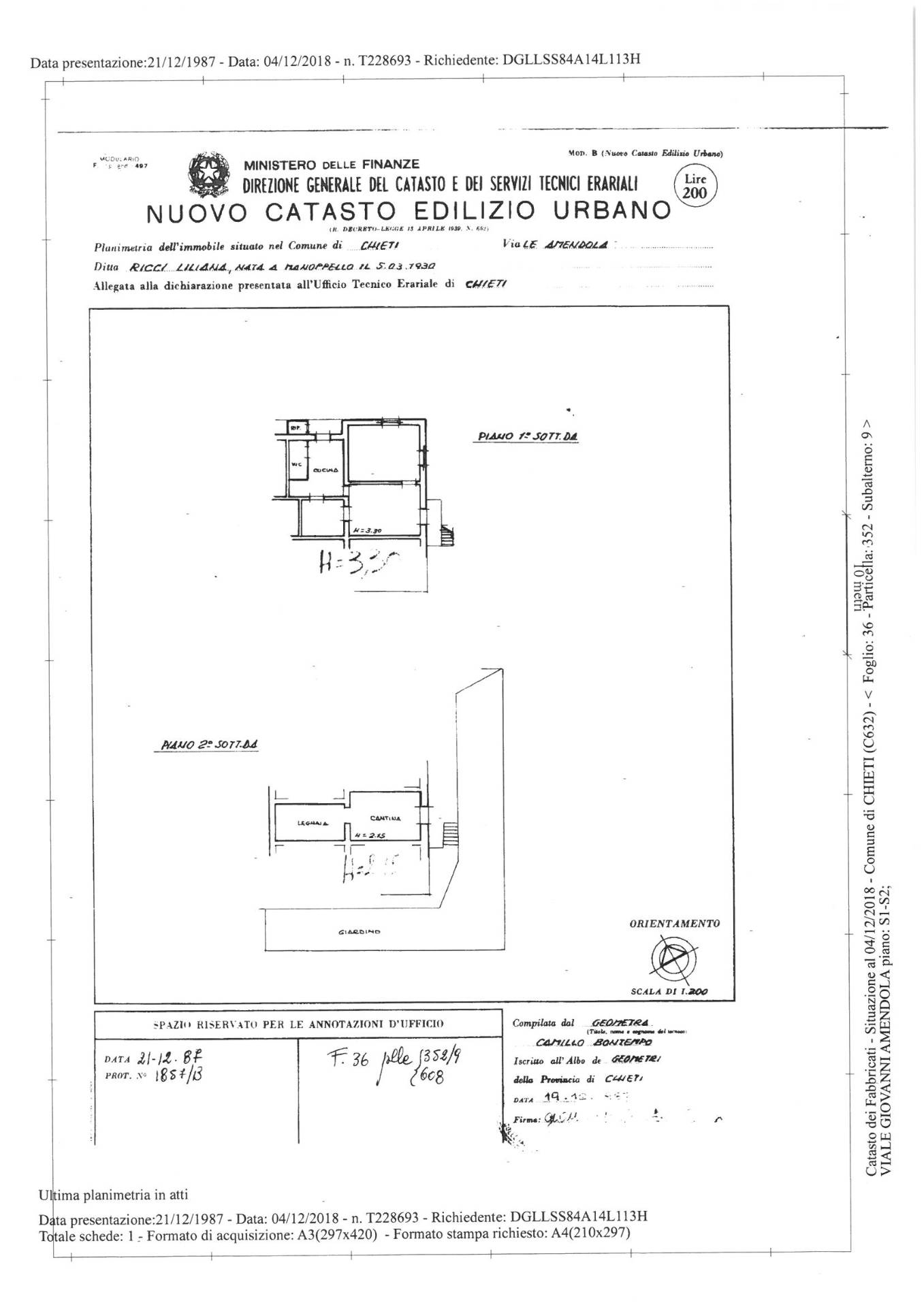 Chieti, a pochi passi dalla clienica Spatocco e dalla villa comunale, appartamento in palazzo stile liberty posto al piano 1s e composto da: ingresso su soggiorno, cucina con tinello, camera da letto matrimoniale, bagno, ripostiglio, n. 2 balconi oltre a n. 2 vani al piano s2 (non collegati tra loro) adibiti ad uso cantina/ legnaia.