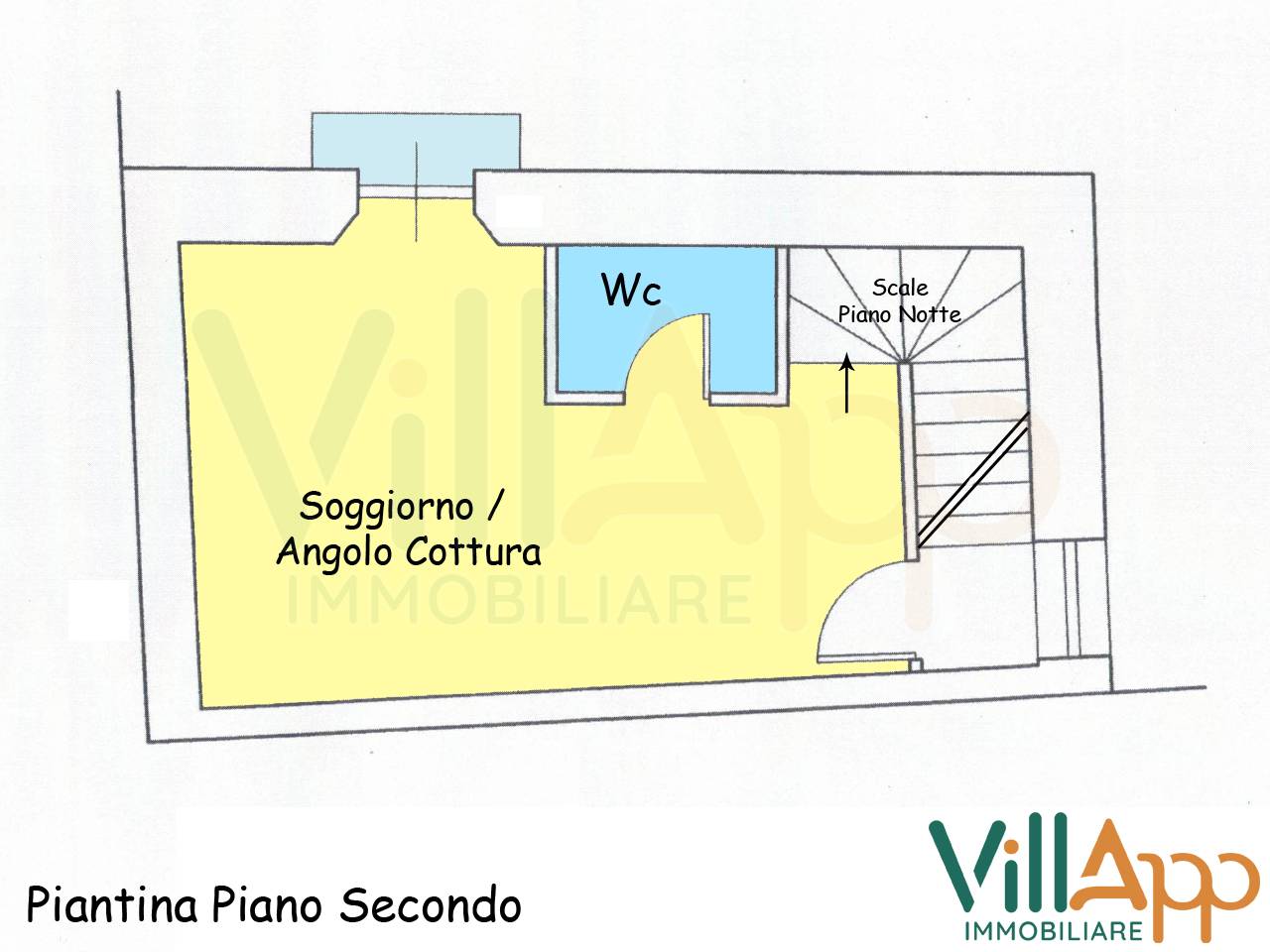 Piano Secondo: Soggiorno angolo Cottura con Soggiorno e Bagno di servizio.