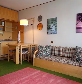 L'ingresso è direttamente nel corridoio che accompagna alla luminosa zona giorno dotata di angolo cottura a vista. Nel resto della stanza è presente un tavolo da pranzo e un divano letto matrimoniale.