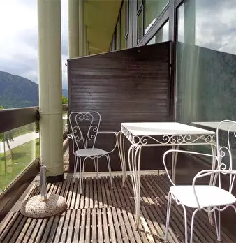 La portafinestra permette di uscire sul terrazzo di circa 10 mq con vista aperta sulle montagne.