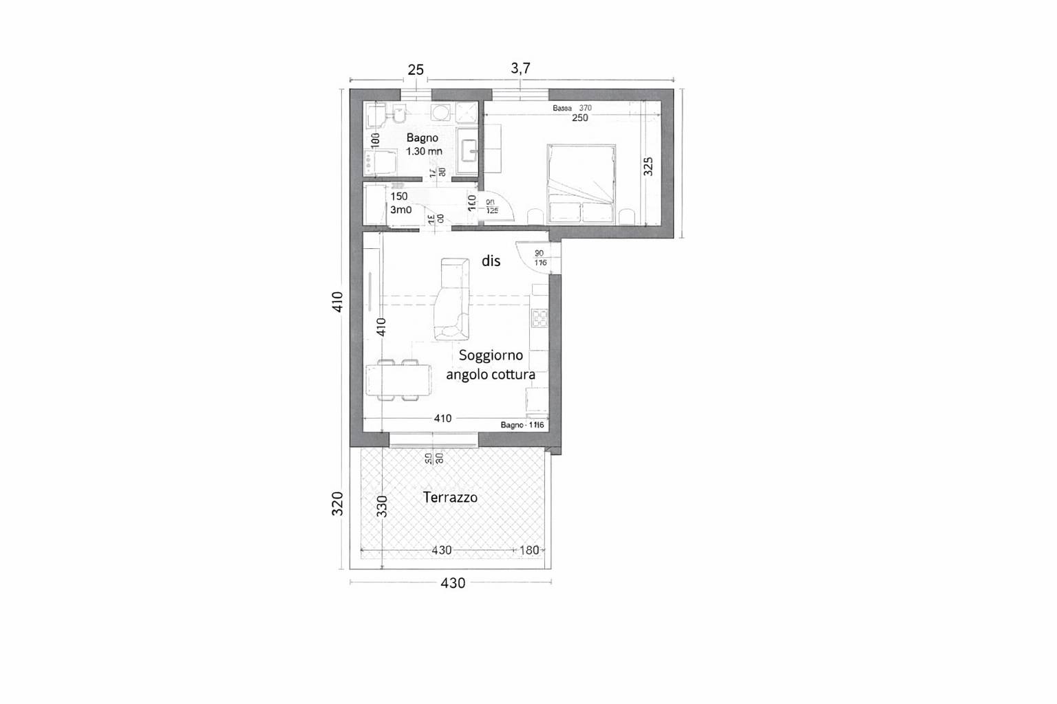 L’appartamento è composto da: luminoso soggiorno con cucina a vista, camera matrimoniale, bagno e terrazzo coperto.