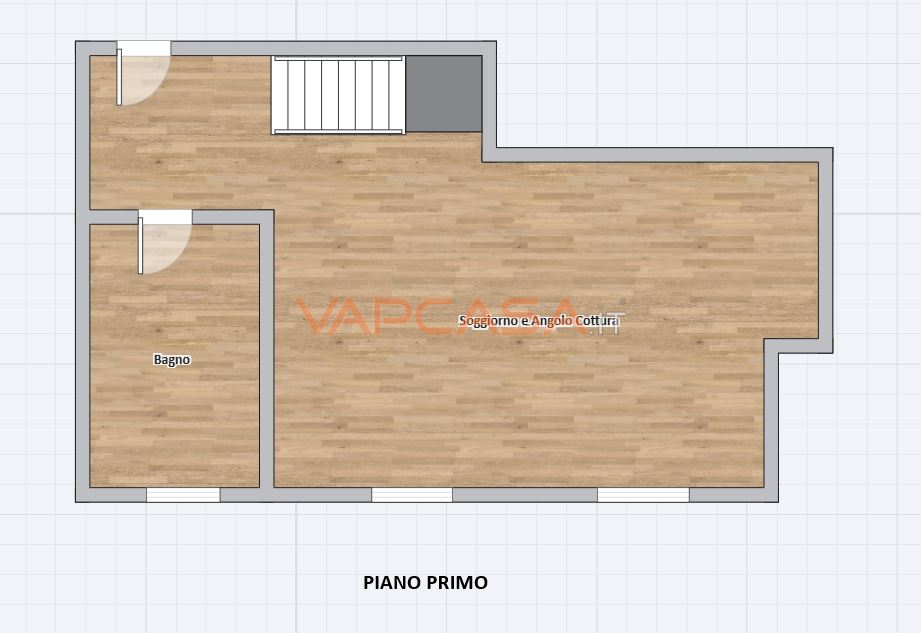 L’ingresso è al primo piano, dove si apre un accogliente soggiorno con angolo cottura e bagno, perfetto per la zona giorno e la vita quotidiana.