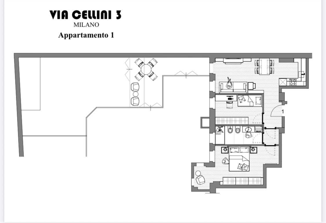 COMPOSTO: INGRESSO , AMPIA ZONA SOGGIORNO CON CUCINA A VISTA CHE AFFACCIA SU UNO SPLENDIDO TERRAZZO DI SETTANTA METRI QUADRATI ,