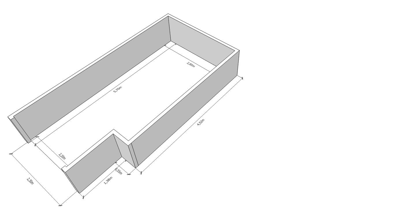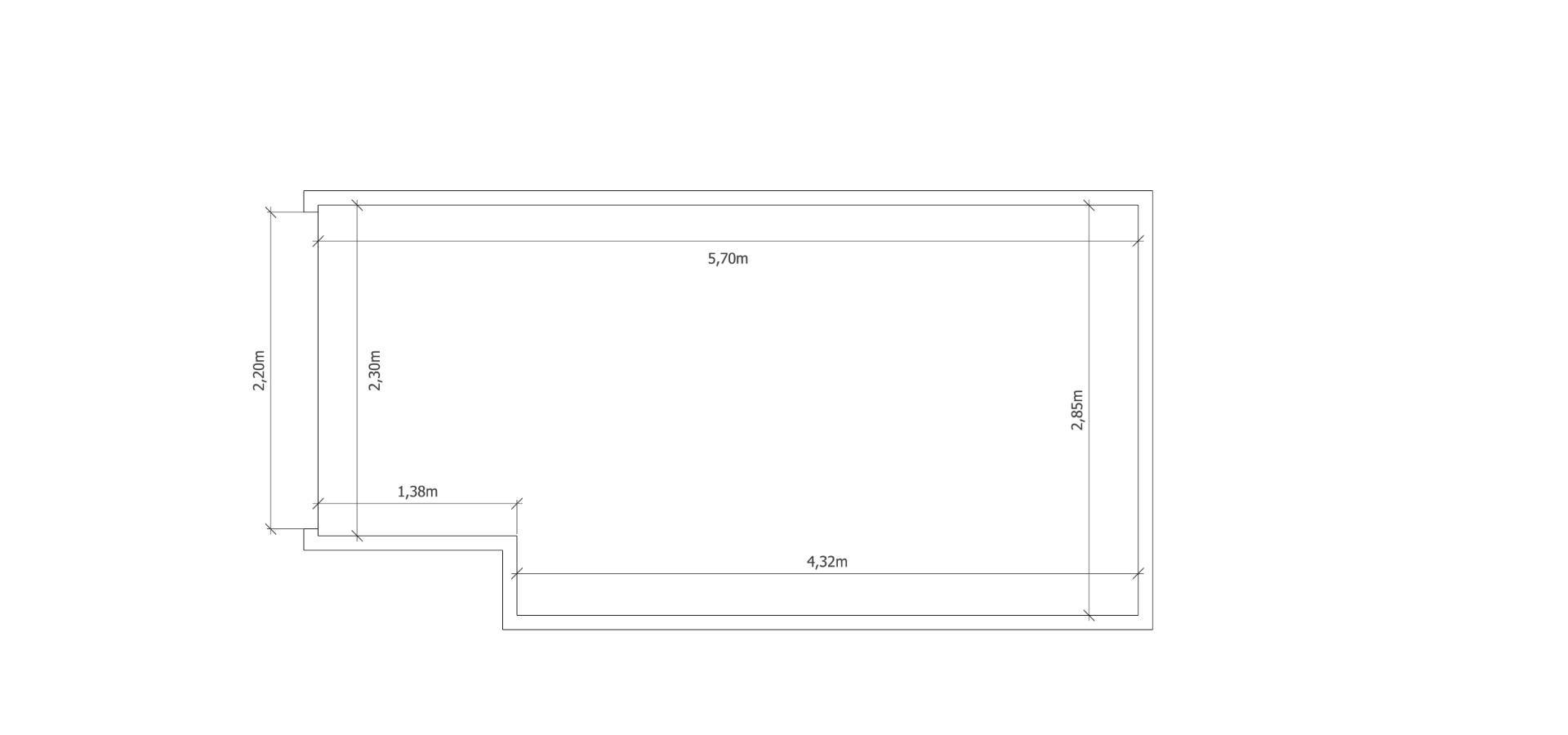 Misure mt 5,70 (lunghezza) x 2,85 (larghezza massima), larghezza minima mt 2,30; larghezza apertura della saracinesca mt 2,20.