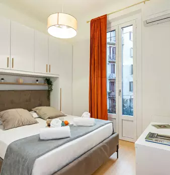 Bilocale in via Melchiorre Gioia 53, Milano: camera matrimoniale arredata con ampio armadio; salo...