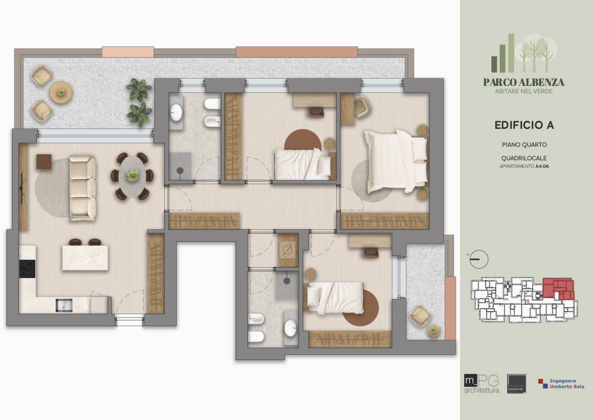 In luogo di un'area commerciale ormai dismessa prende vita uno spazio abitativo moderno e altamente sostenibile. Il complesso di compone di due eleganti edifici di 5 piani fuori terra, studiati per ottimizzare la luce naturale e gli affacci sul parco circostante. Sono presenti appartamenti con giardini ad uso esclusivo o ampi e luminosi balconi dotati di parapetti in vetro per i piani superiori. Proponiamo ottimo quadrilocale con terrazzo posto all'ultimo piano e così composto: soggiorno con angolo cottura affacciato sul terrazzo, tre camere, due servizi, ripostiglio, balcone, cantina e possibilità box. Possibilità di personalizzare gli interni. Consegna a primavera 2028. Info sul sito www.parcoalbenza.it