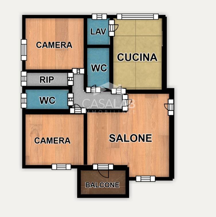 ingresso su ampio soggiorno con balcone, cucina abitabile con struttura in muratura e annessa una comoda lavanderia, due camere da letto spaziose, doppi servizi (di cui uno con vasca ed uno con doccia) e utile ripostiglio finestrato.