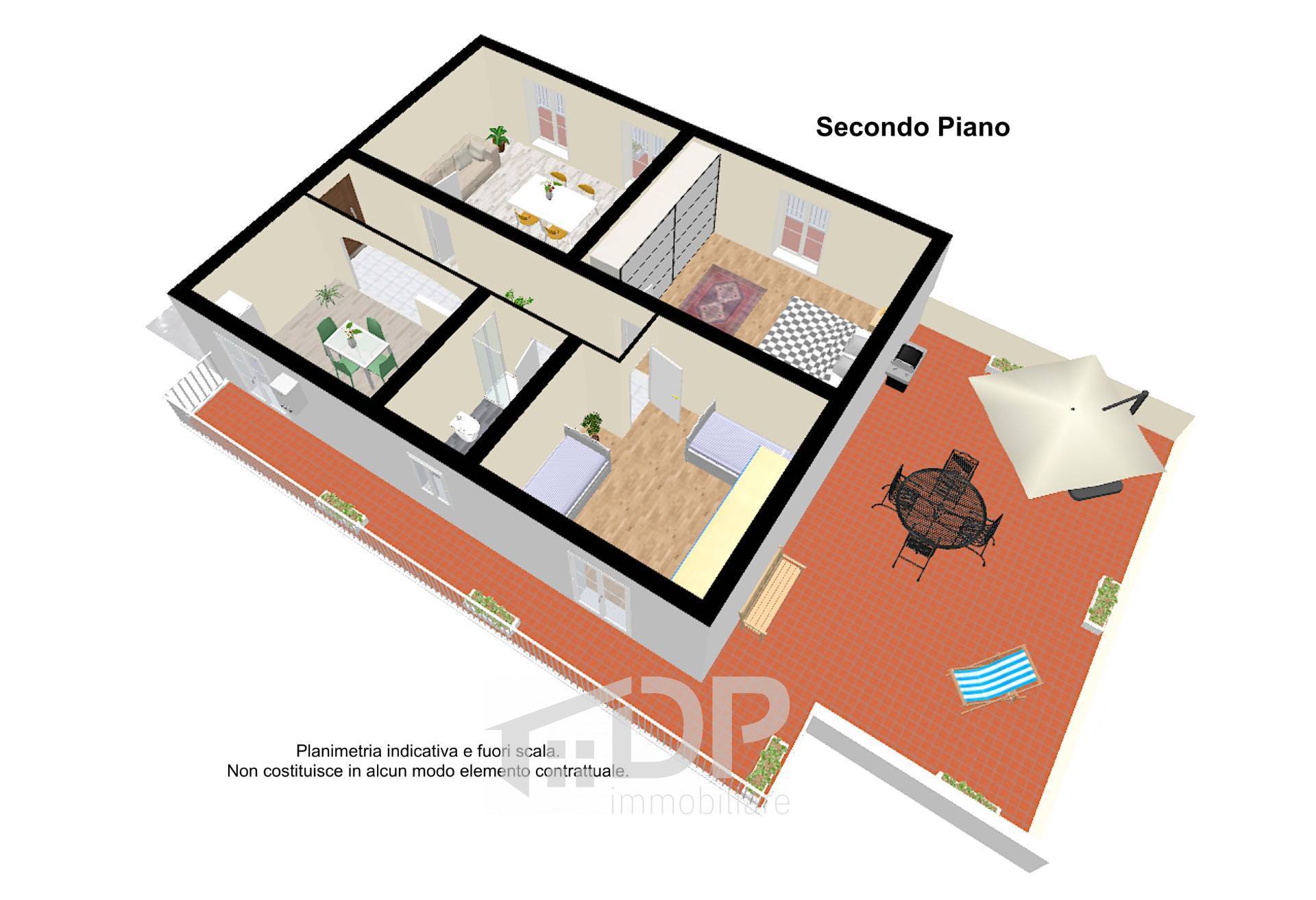 La zona notte, separata da un disimpegno, comprende due camere da letto una delle quali di circa 20 mq e un bagno con doccia.