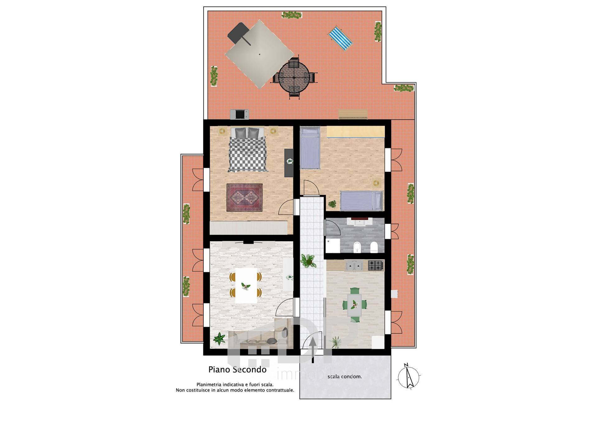 Tutte le stanze affacciano sui due balconi, uno esposto a est e laltro a ovest: da quest'ultimo si accede a un terrazzo di circa 47 mq, recentemente ristrutturato, perfetto per momenti allaperto e da godersi anche nei mesi invernali con listallazione di una serra bioclimatica o una pergotenda. Il panorama che si apre verso il Monte Gennaro regala una bellissima vista.