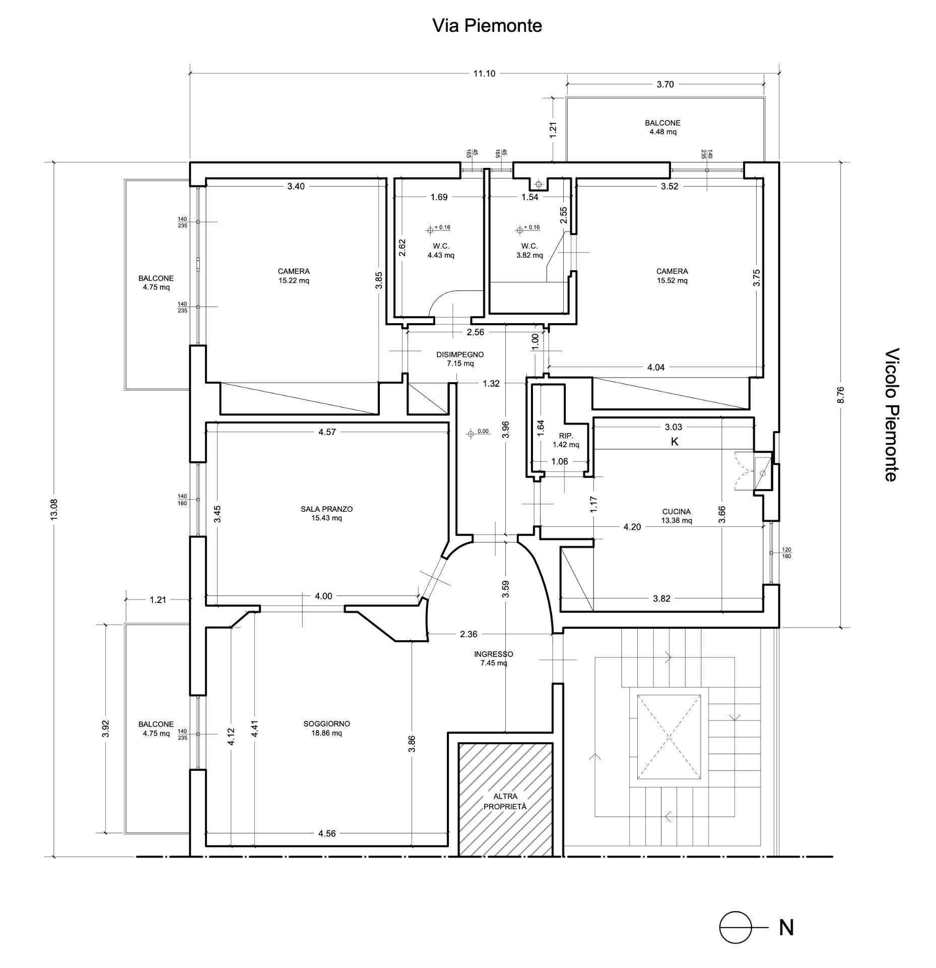 Appartamento al Piano Primo con ascensore, delle dimensioni di 120 mq. circa, composto da ingresso, soggiorno doppio (eventuale 3a camera da letto), cucina abitabile con annessa dispensa, 2 camere da letto matrimoniali, 2 bagni (di cui uno en-suite - entrambi con finestra) e 3 balconi per complessivi 14 mq. circa.