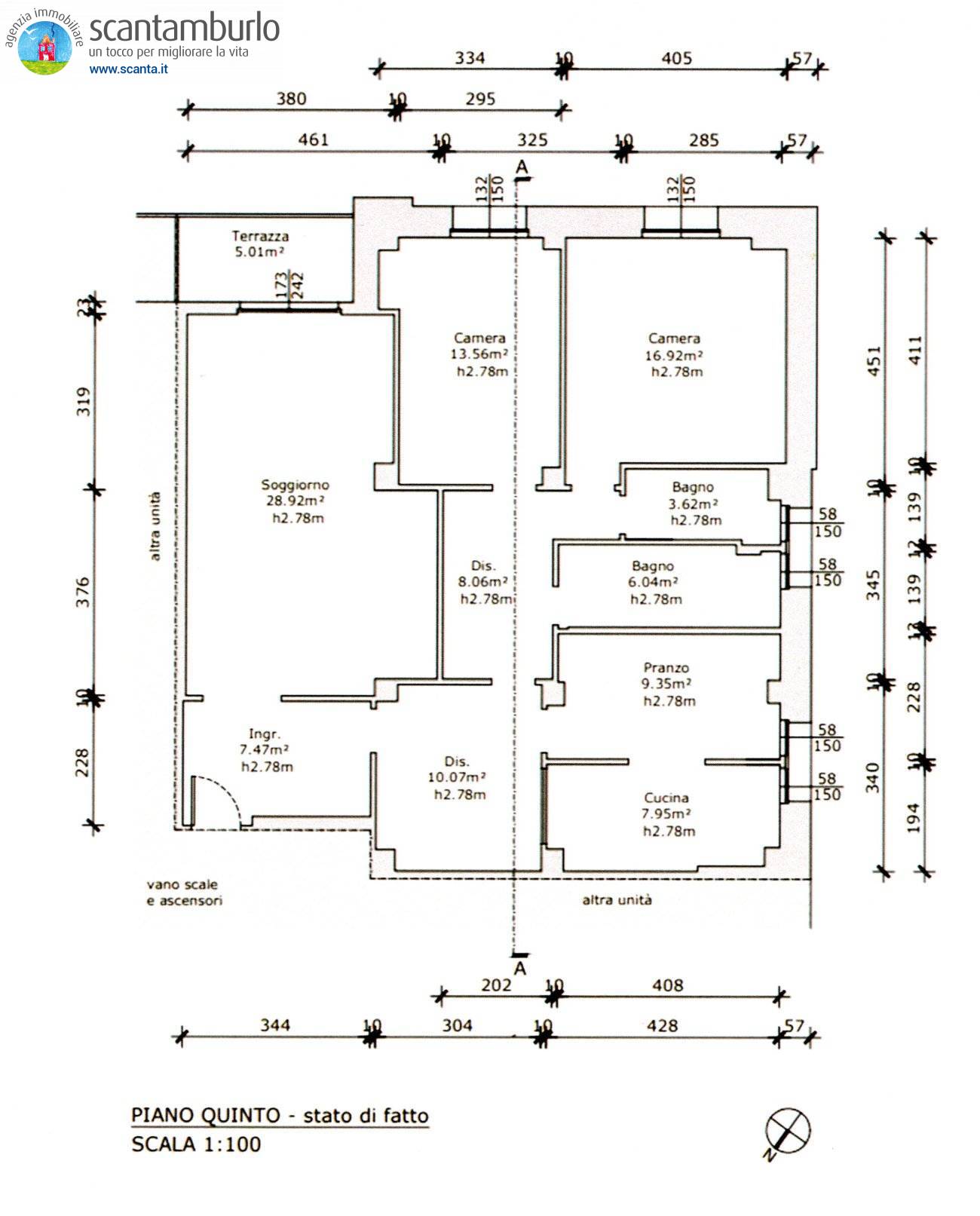 Trattasi di un appartamento luminoso e ben esposto posto al piano quarto mq 122 altezza cm 277 con ascensore composto da: ampio e luminoso ingresso-soggiorno salotto con terrazzo mq 5,00, ampio corridoio, grande cucina abitabile (possibilità divisione per terza camera, vedi pianta), disimpegno notte con armadio, bagno con vasca, bagno con doccia attacco lavatrice, due camere grandi. Completa l'unità immobiliare un garage-magazzino mq 11 posto al piano interrato larghezza cm 227, altezza cm 227, lunghezza cm 461, foro passaggio larghezza cm 221 altezza cm 205. Lappartamento è dotato di porta blindato, caldaia elettrica per acqua calda in cucina, riscaldamento condominiale con conta ore (caldaie nuove e capotto esterno bonus 110 edificio classe B), ascensore. Spese condominiali /anno 3000,00 compreso il fisso annuo del riscaldamento. In corso sanatoria per la sistemazione burocratica. Si trova in una zona vicino al centro e servita da tutti i servizi utili. Disponibili altri appartamenti nel nostro sito www.scanta.it e in Agenzia.