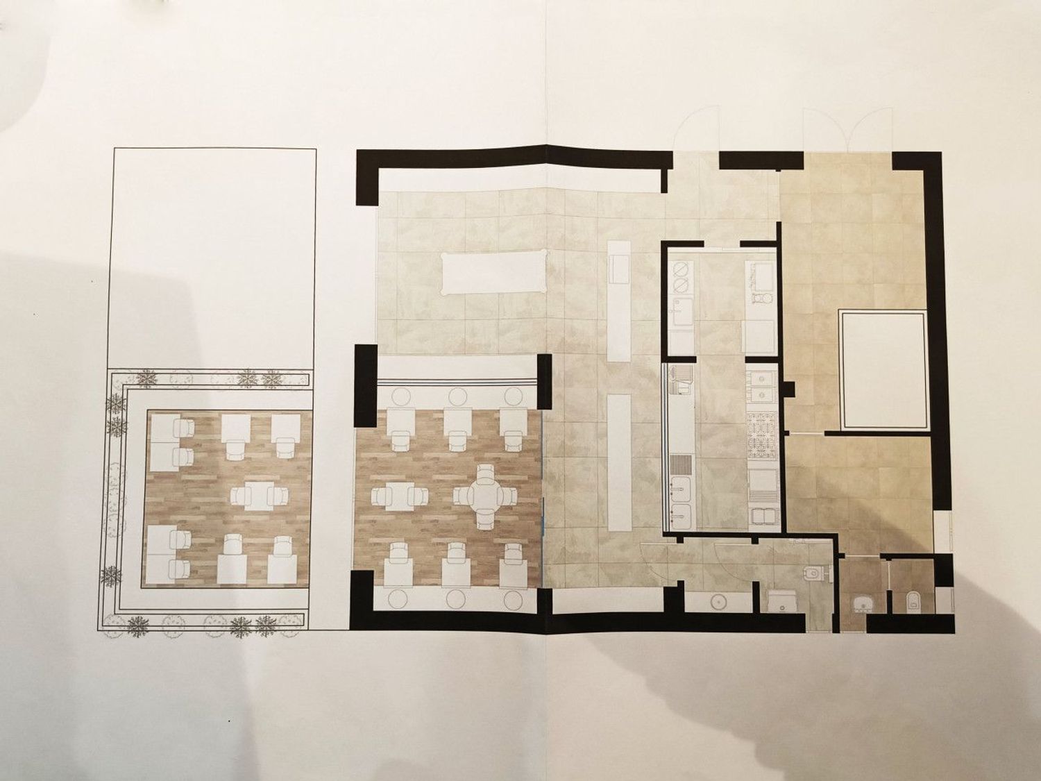 Gli interni sono moderni e curati nei minimi dettagli: pavimenti effetto pietra naturale, pareti rivestite in mattonelle lucide colorate ed arredi contemporanei creano un'atmosfera raffinata ma accogliente; ampie scaffalature espositive permettono la valorizzazione dei prodotti alimentari confezionati mentre le grandi vetrate garantiscono luminosità agli ambienti. Il tutto è impreziosito dalla presenza di impiantistica nuova ed illuminazione a LED dal design ricercato.