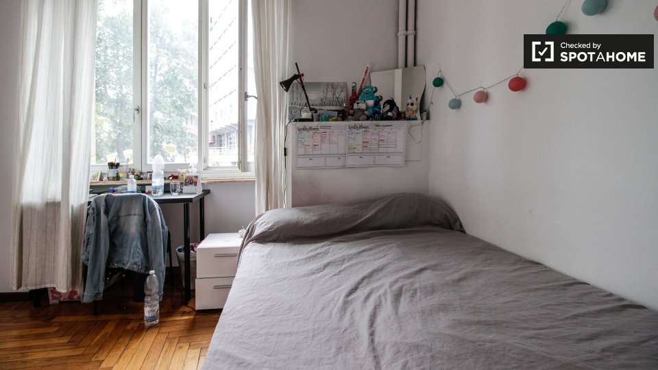 Ci sono camere soleggiate disponibili per l'affitto in questo appartamento con 6 camere da letto e 3 bagni a Vanchiglia. In un edificio storico, l'appartamento si sente grande con soffitti alti e grandi porte in tutto. L'area principale condivisa è la cucina abitabile completamente attrezzata e dotata di TV e accesso a un balcone. Ogni camera è completamente arredata e riceve molta luce naturale.