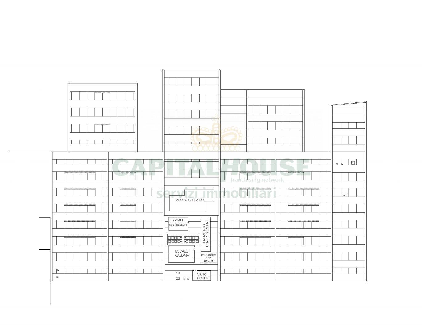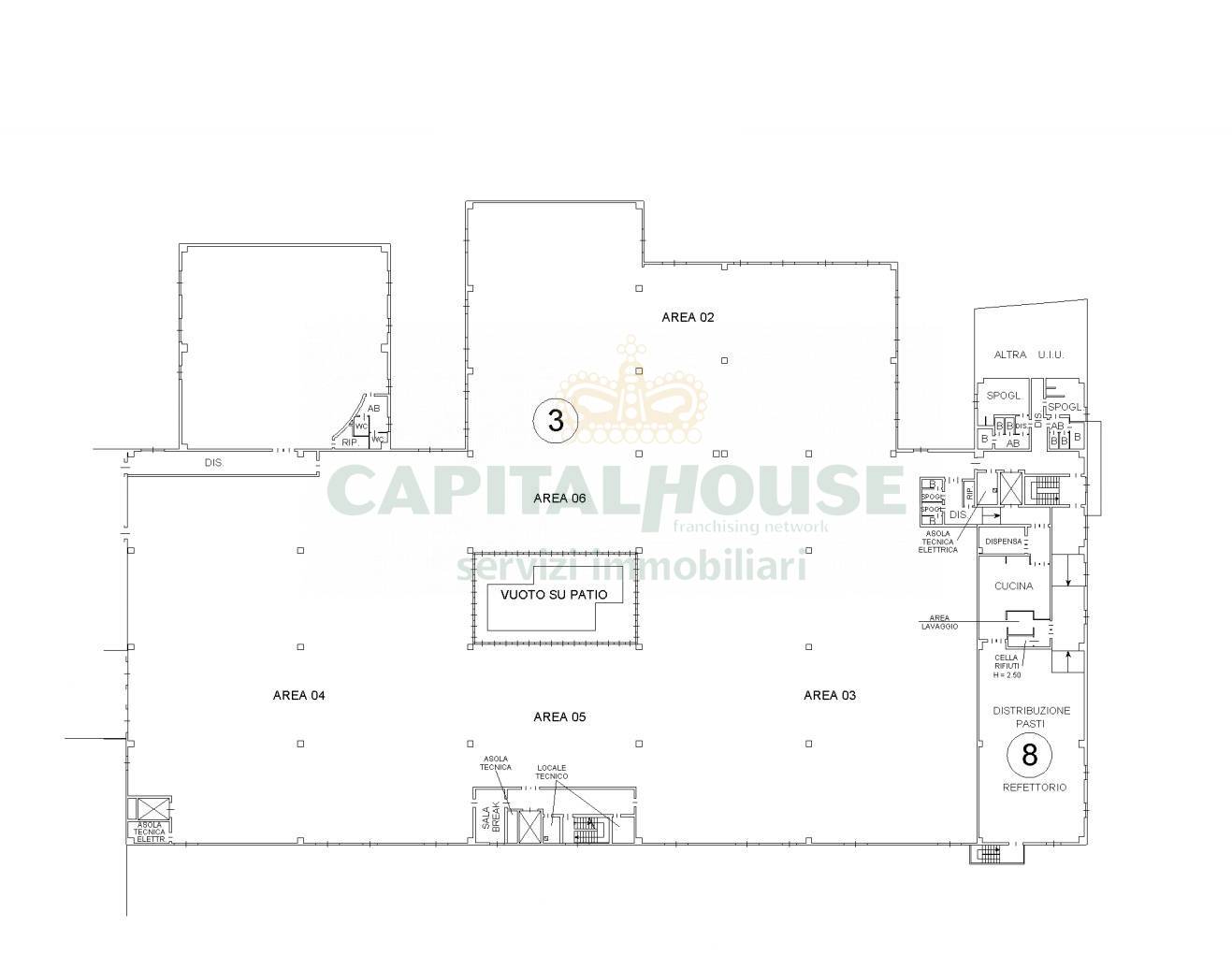 Piano Terra: Ampio spazio produttivo open space, dotato di spogliatoi, locali tecnici e un suggestivo patio centrale che migliora luminosità e comfort lavorativo. Tre montacarichi e due vani scala garantiscono un’efficiente connessione verticale.