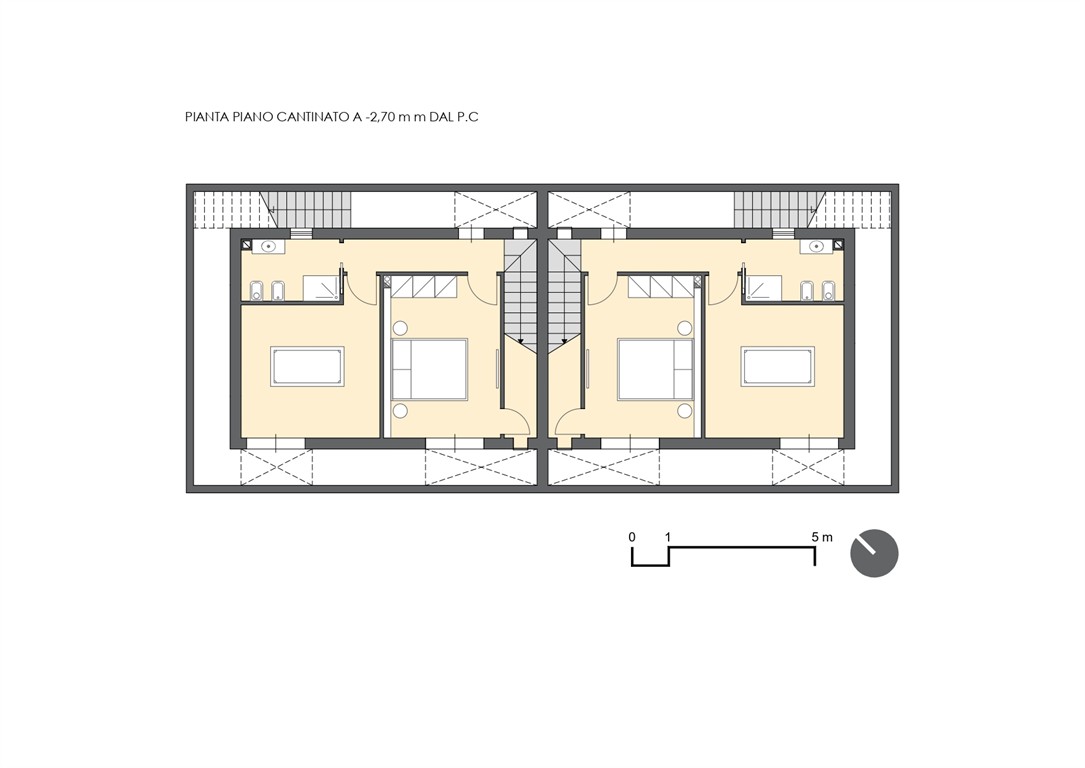 Le ville bifamiliari si sviluppano su tre livelli – piano cantinato, piano terra e primo piano – per una superficie complessiva di circa 150 mq, a cui si aggiungono portico, terrazza e giardino privato.