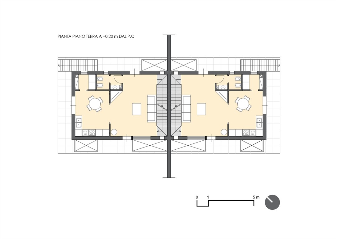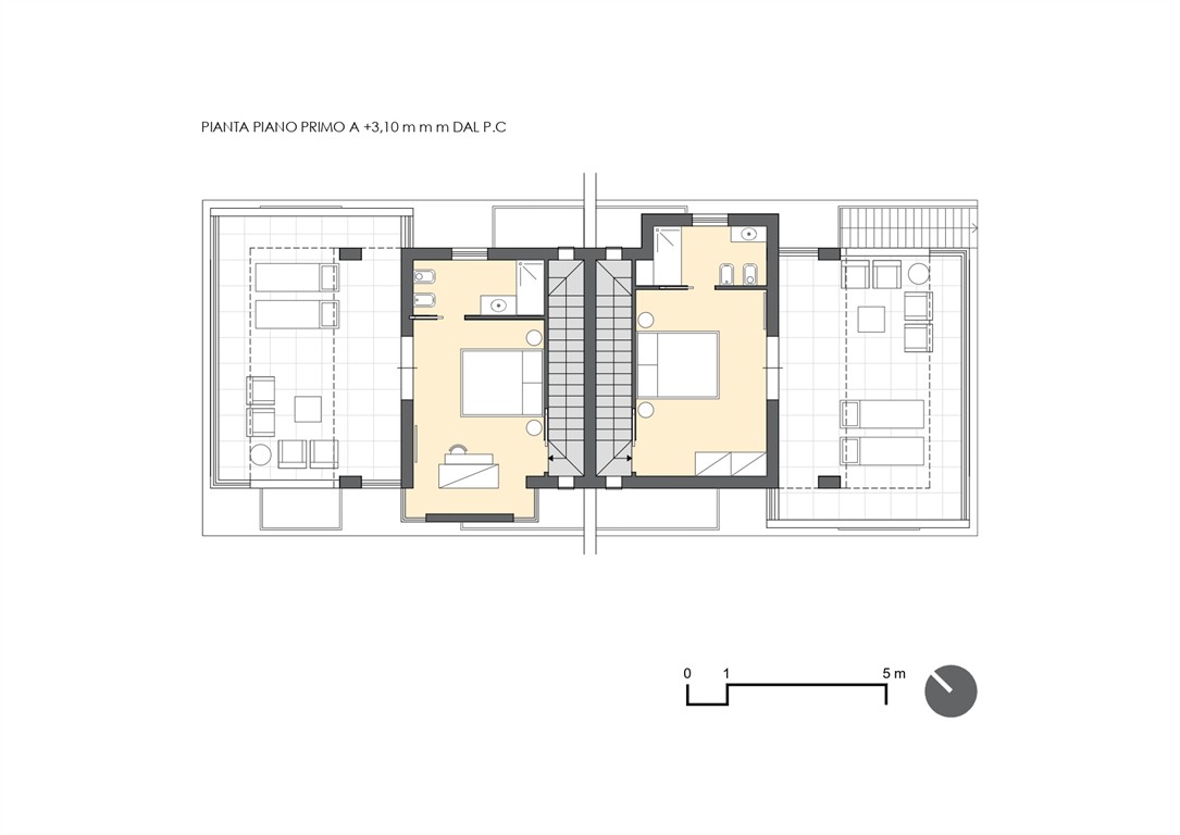 Le ville bifamiliari si sviluppano su tre livelli – piano cantinato, piano terra e primo piano – per una superficie complessiva di circa 150 mq, a cui si aggiungono portico, terrazza e giardino privato.