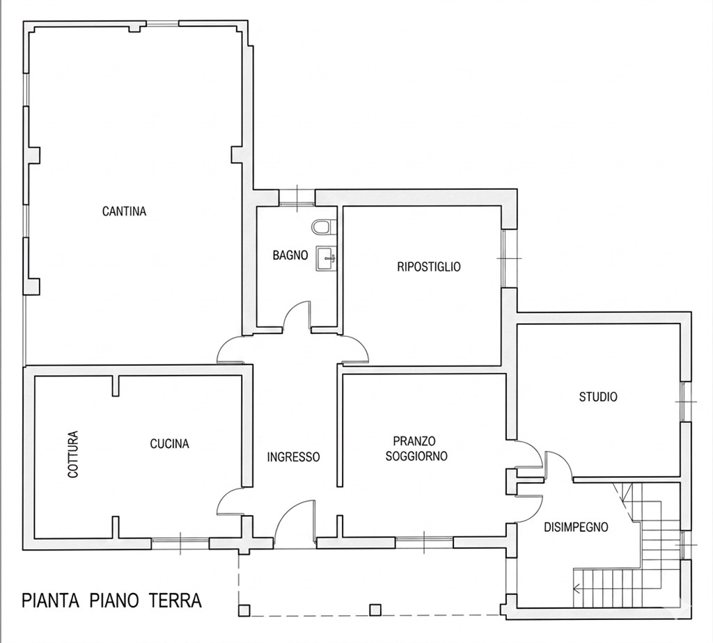 • Piano Terra: Ingresso protetto da porticato, ampio soggiorno, cucina abitabile, due camere da letto matrimoniali, bagno e una generosa cantina collegata internamente.