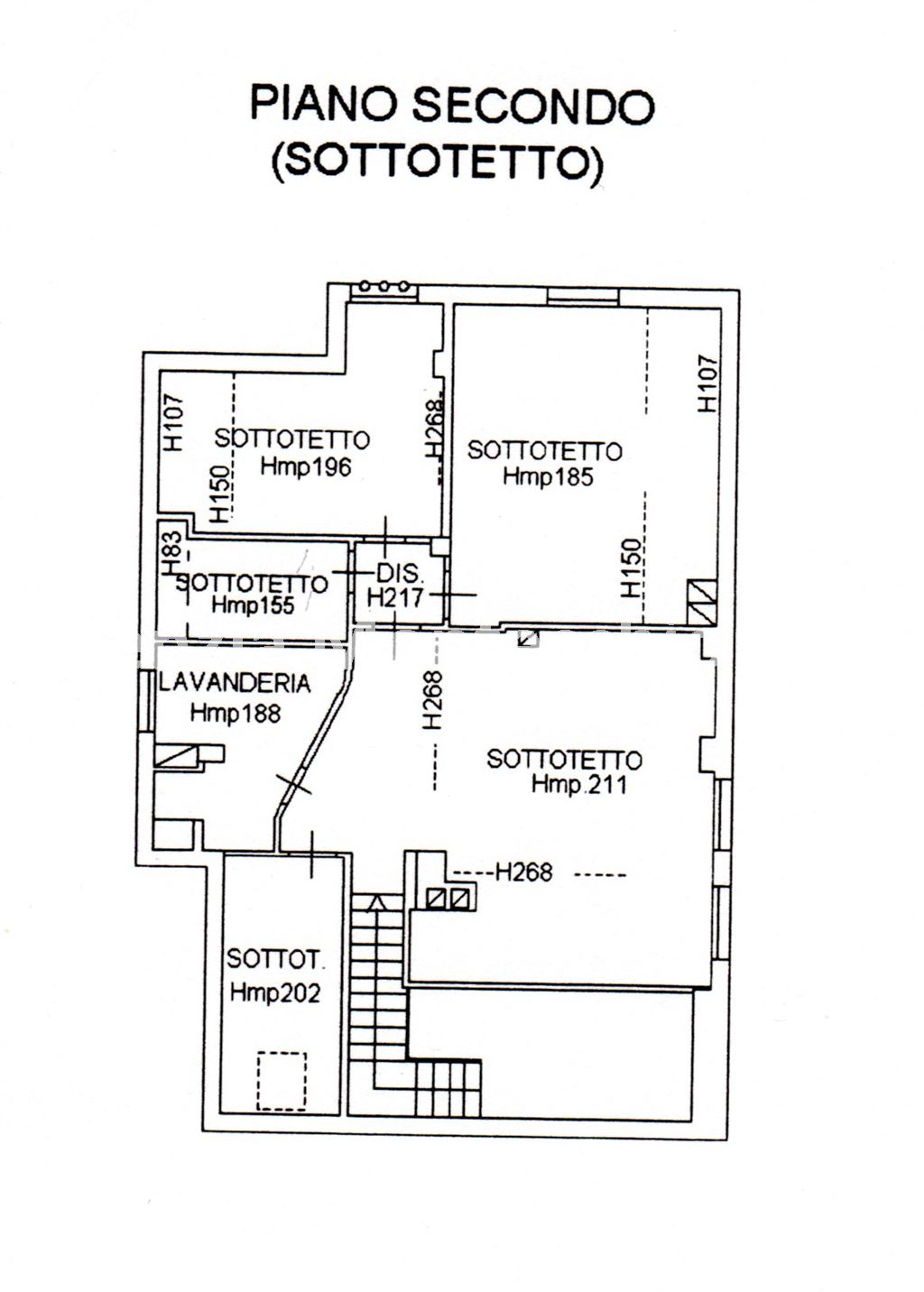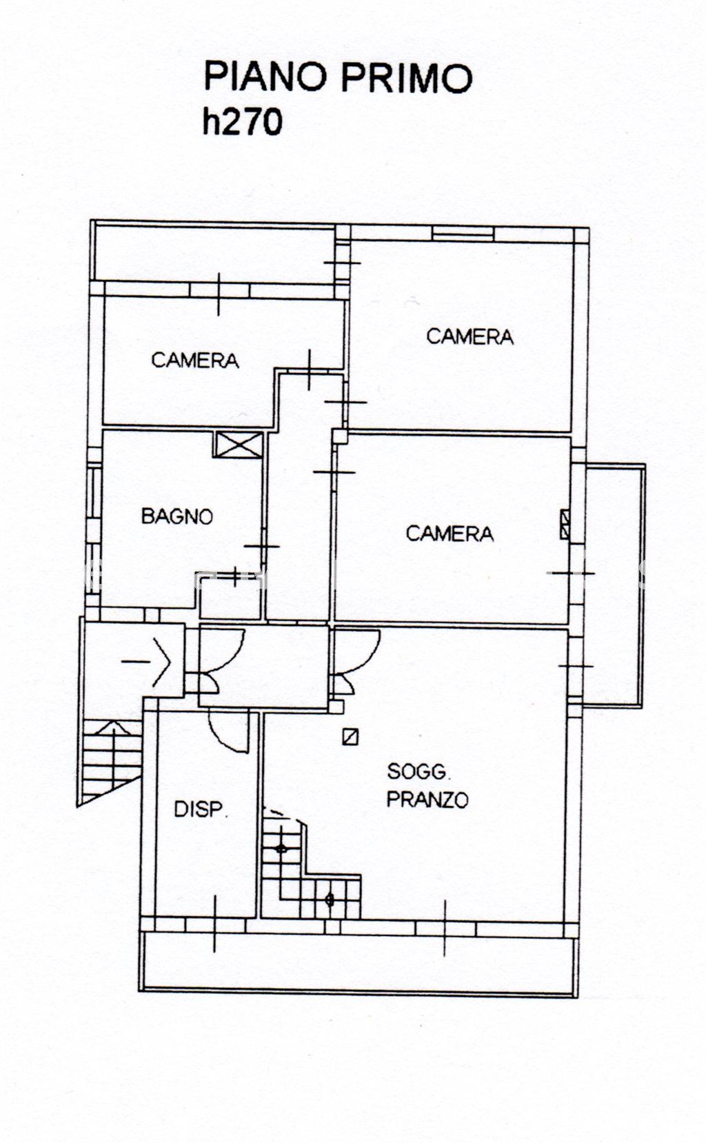 Piano primo: ampia zona giorno con soggiorno dotato di camino, cucina e tre balconi; la zona notte comprende tre camere da letto e bagno.