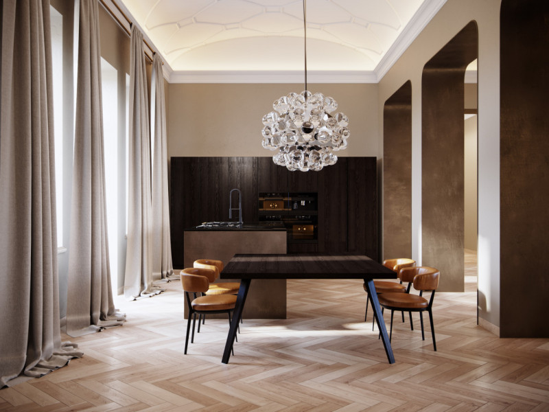 Si accede all'abitazione tramite le scale o con ascensore che si apre direttamente all'ingresso dell'appartamento. Ci accoglie un ampio open space di oltre 70 mq travato a vista e con doppia altezza avente l'affaccio sulla via storica. La cucina ad isola ha l'esposizione sull'interno del palazzetto. Una comoda lavanderia completa questa zona.