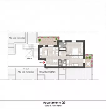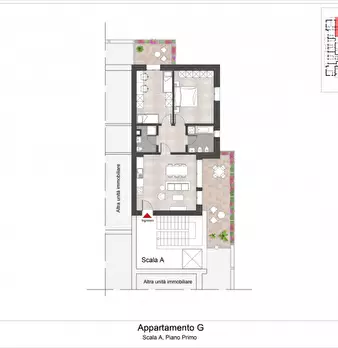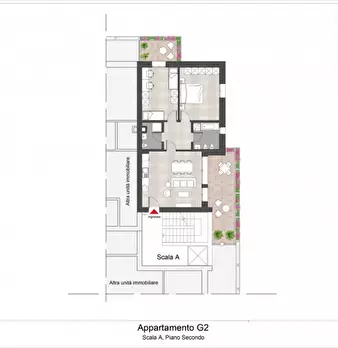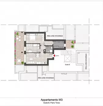 L'ingresso si apre su un luminoso soggiorno con angolo cottura e con accesso diretto al terrazzo perfetto per godersi momenti di relax all'aria aperta.