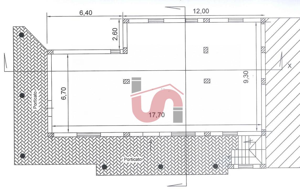 Il fabbricato, di complessivi 604mq commerciali coperti è costituito da una struttura portante in cemento armato a due livelli oltre la copertura, il tutto con rifiniture allo stato rustico, con tamponature in blocchi di laterizio alveolato dello spessore di cm.35. La struttura realizzata ha forma rettangolare, con un fronte totale di ml. 35,50 ed un laterale di m.10,00, ed una risega sul lato posteriore ed è attualmente divisa in due porzioni indipendenti che si sviluppano a specchio.