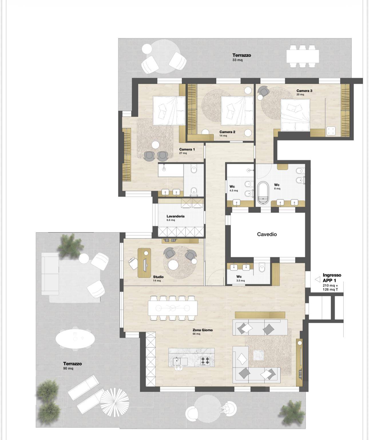 La ristrutturazione totale consente la massima libertà progettuale. Nellipotesi distributiva proposta lappartamento si sviluppa con ingresso su un ampio salone soggiorno con angolo cottura, tre grandi camere matrimoniali, uno studio utilizzabile anche come quarta camera da letto, quattro bagni di cui tre finestrati, locale lavanderia e corridoio dedicato alla zona notte. Una soluzione pensata per chi cerca metrature generose, comfort e funzionalità, senza rinunce.