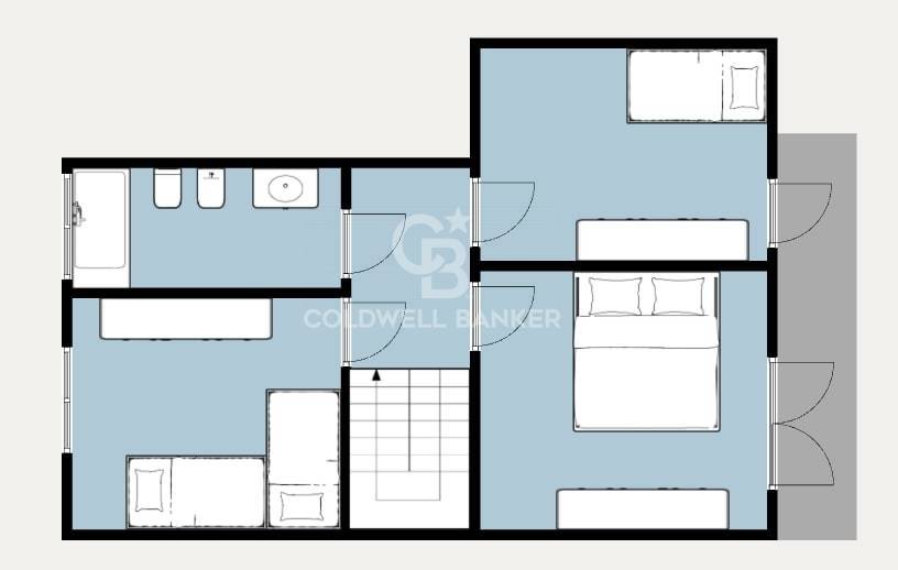 Salendo al piano superiore, la zona notte ospita tre camere da letto, di cui due con accesso a un terrazzo da cui si può intravedere il mare, e un bagno finestrato.