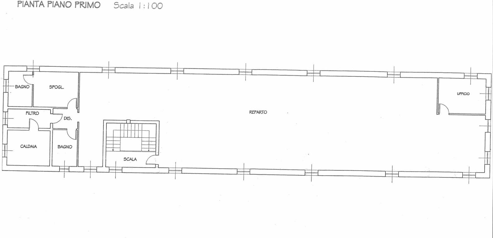 Suddivisione: spazio espositivo 305 mq, ufficio 15 mq, due bagni e ripostigli 60 mq