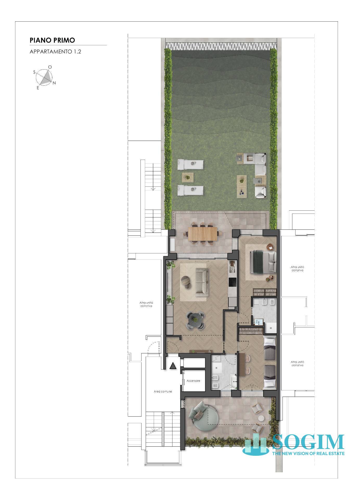 Al piano primo proponiamo trilocale con terrazzi e giardino privato così composto: ingresso, soggiorno con cucina a vista servito dal primo terrazzo, camera matrimoniale con servizio e uscita sul terrazzo, camera singola anch'essa servita dal terrazzo e il secondo servizio. Completa la soluzione la presenza del giardino privato raggiungibile dal terrazzo della zona giorno.