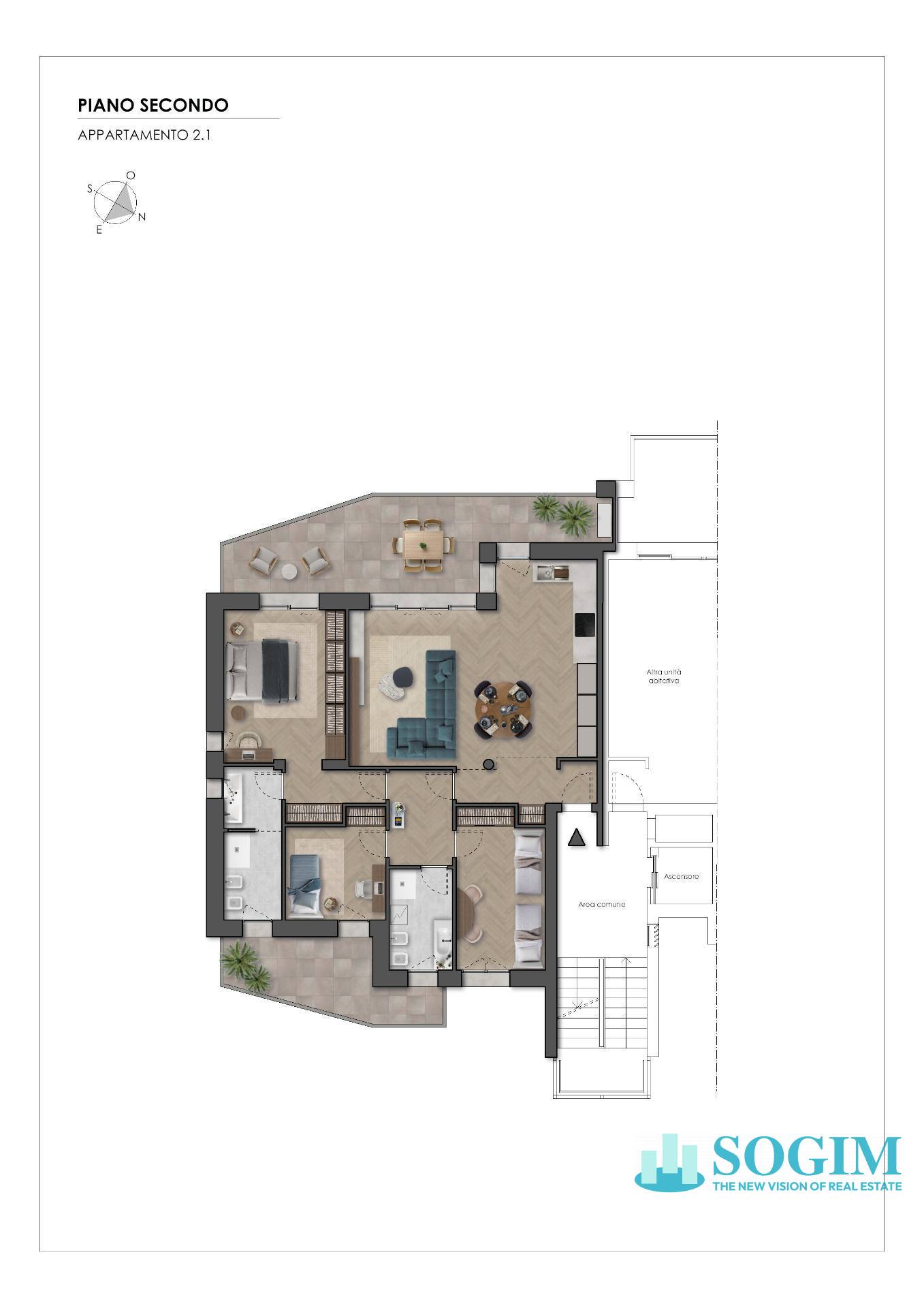 Al piano secondo proponiamo quadrilocale con doppio terrazzo così composto: ingresso, soggiorno con cucina a vista servito dal primo terrazzo, camera matrimoniale con servizio e uscita sul terrazzo, due camere singole anch'esse servite dal terrazzo e il secondo servizio.