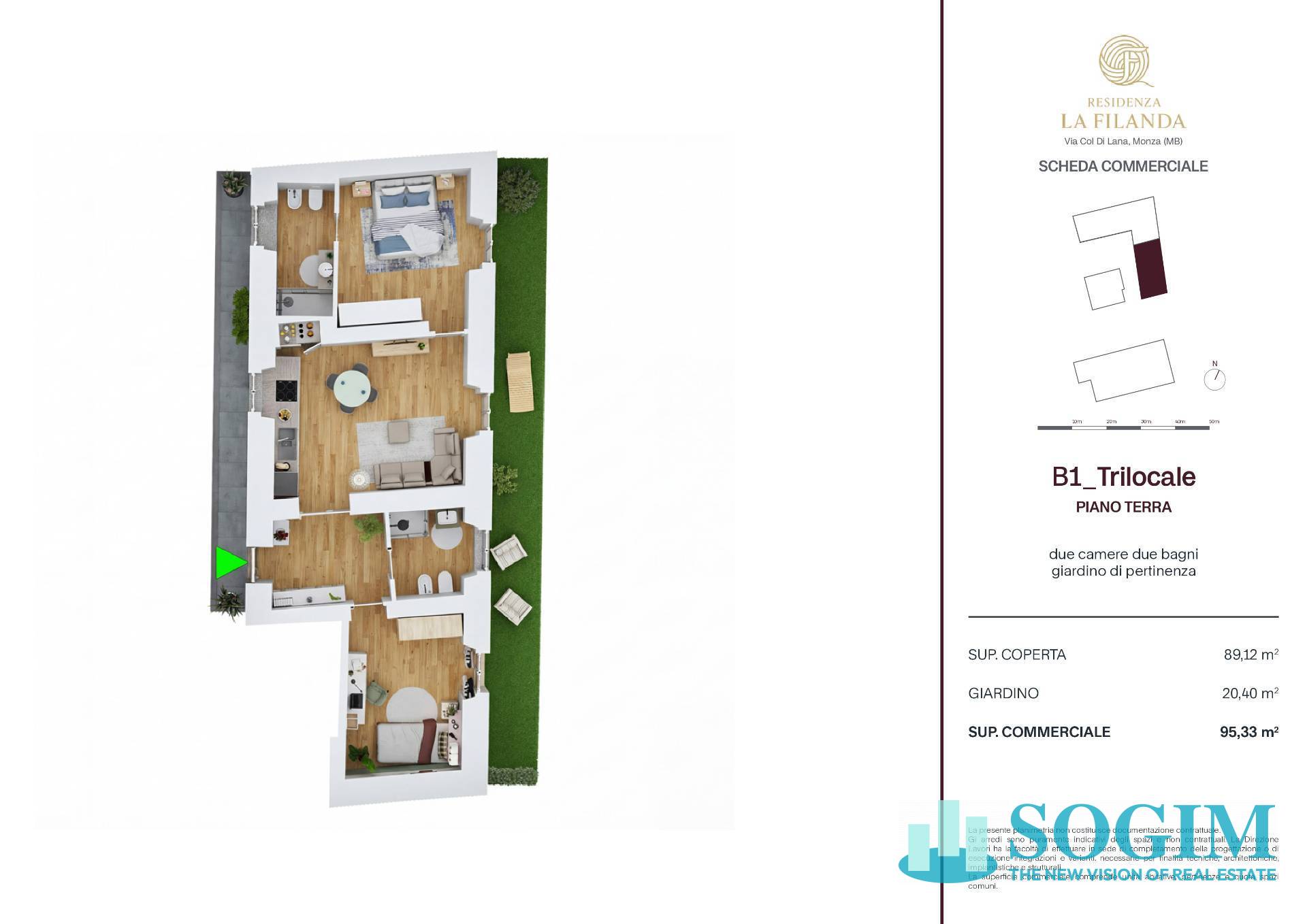 Al piano terra proponiamo trilocale con giardino così suddiviso: