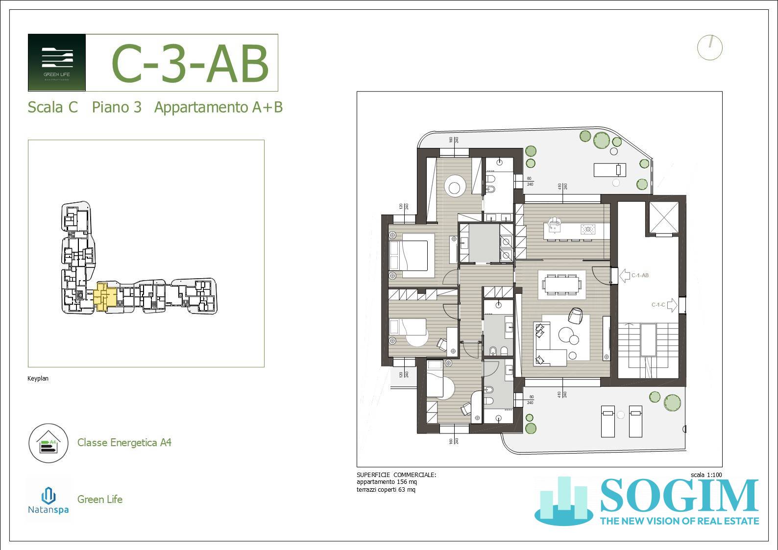 Al terzo piano proponiamo quadrilocale di 156 mq interni così composto: ingresso sul soggiorno con cucina a vista o abitabile, tramite disimpegno si accede alla zona notte composta da suite matrimoniale con bagno in camera e cabina armadio, altre due camere e altri due servizi e la lavanderia. Completa la soluzione la presenza di due terrazzi per 63 mq complessivi.