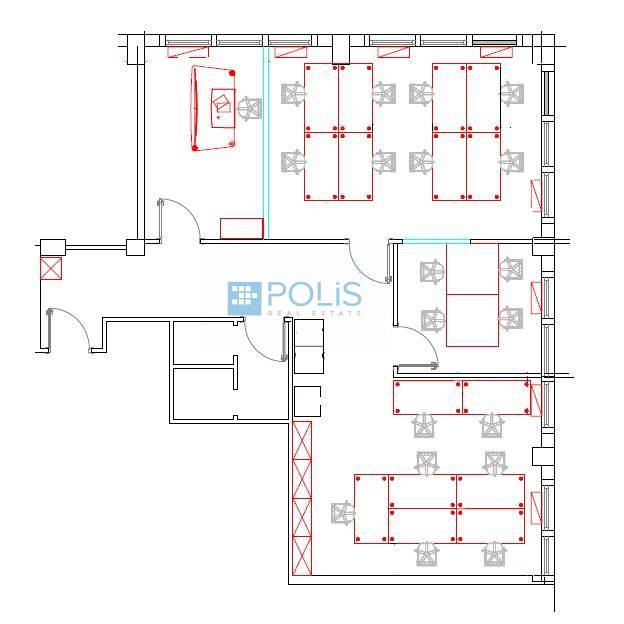 L'ufficio, luminoso e ben distribuito, è composto da ingresso, tre funzionali uffici, ampia sala operativa e doppi servizi con antibagno.
