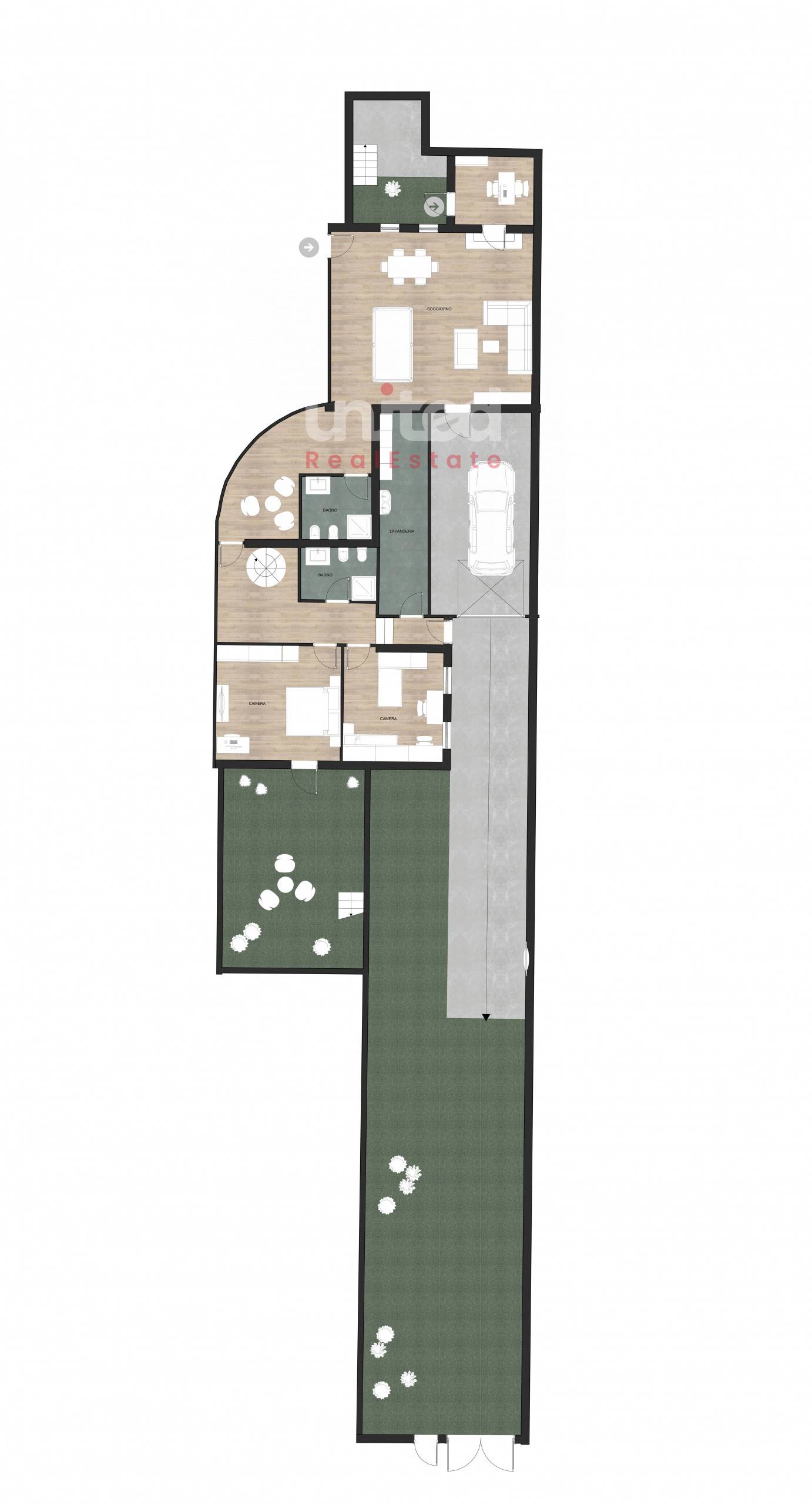 Dal cancello un lungo viale ci conduce all'ingresso della casa e una comoda rampa porta invece all'ampio box auto.
