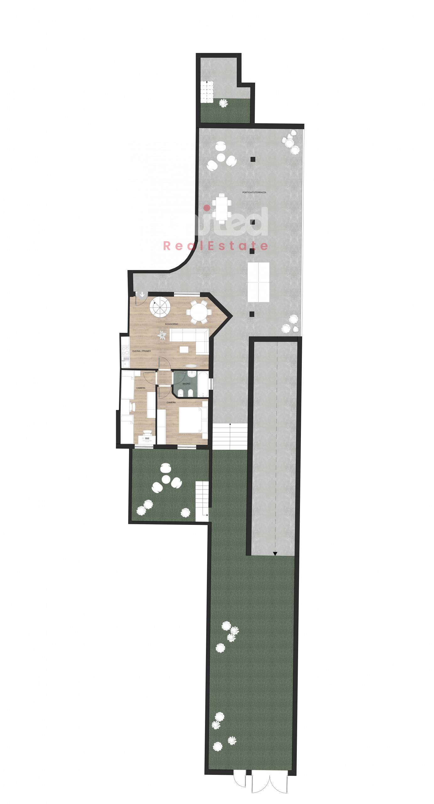 Al piano rialzato troviamo un salone con angolo cottura, un disimpegno, due camere da letto e un bagno. All'esterno è presente un terrazzo di circa 80 mq con camino/barbecue in muratura e un ampio portico verandato attrezzato.