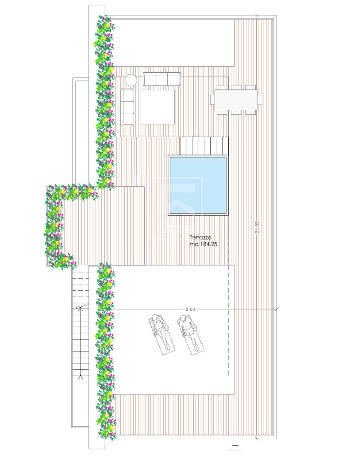 Al piano tetto troviamo un esclusivo terrazzo privato di ben 185 mq adibito a solarium e dotato di jacuzzi.
