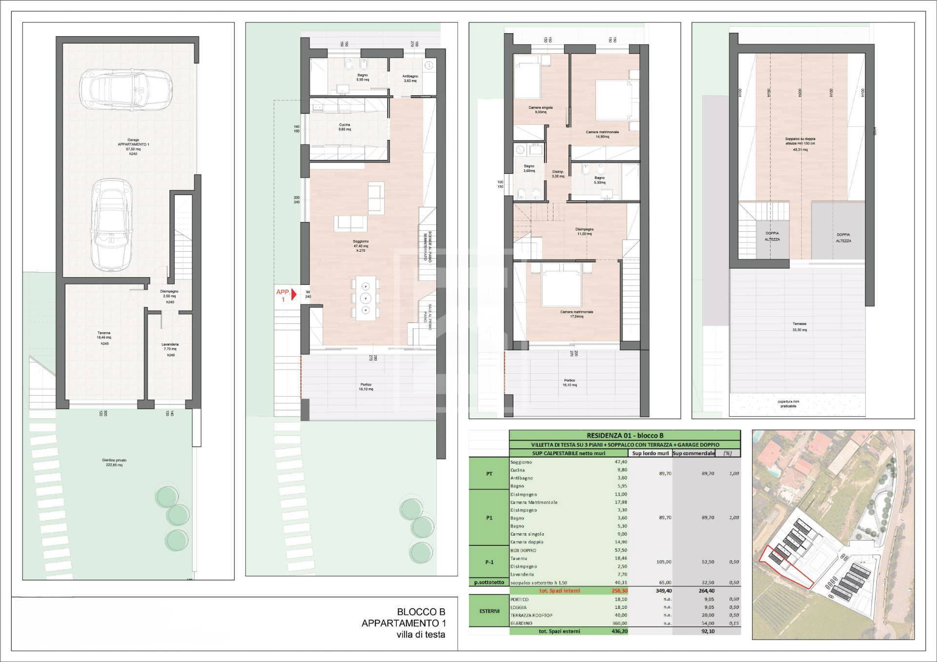 Villa 1: è una residenza esclusiva, progettata per offrire ampi spazi e una disposizione degli ambienti perfetta. Al piano terra, un luminoso soggiorno di 47 mq, un grande bagno, una cucina funzionale e un porticato ideale per godersi le calde giornate estive. Il giardino si sviluppa su tre lati, garantendo una privacy totale e ampi spazi all'aperto. Nell'interrato, troviamo un locale polifunzionale, una spaziosa lavanderia e un garage di 57,5 mq. Al piano primo, un comodo disimpegno offre spazio per armadiature e conduce a una camera matrimoniale, una camera singola, due bagni e una grande camera padronale con terrazzo di 18 mq. Da quest'ultima si accede a un sottotetto di 40 mq, perfetto per essere trasformato in uno spazio aggiuntivo, a seconda delle esigenze.