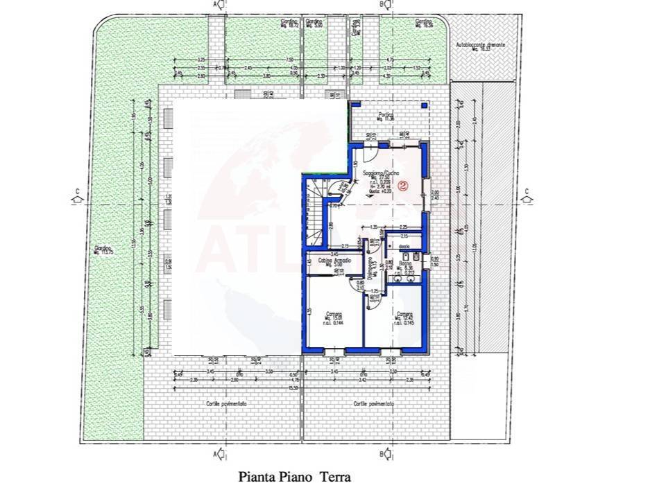 L'appartamento è così composto: Ingresso in spaziosa e luminosa zona giorno open space con accesso al porticato e al giardino frontale, disimpegno, camera padronale con cabina armadio e accesso alla corte pavimentata privata sul retro, camera doppia e bagno con doccia.