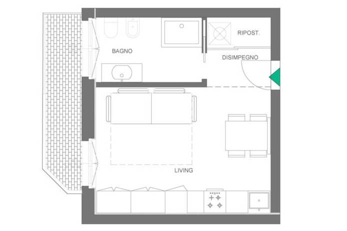 Internamente l'appartamento sarà composto da ampio ingresso con ripostiglio / lavanderia, ampio soggiorno/letto con angolo cottura e accesso al balcone, ampio bagno finestrato.
