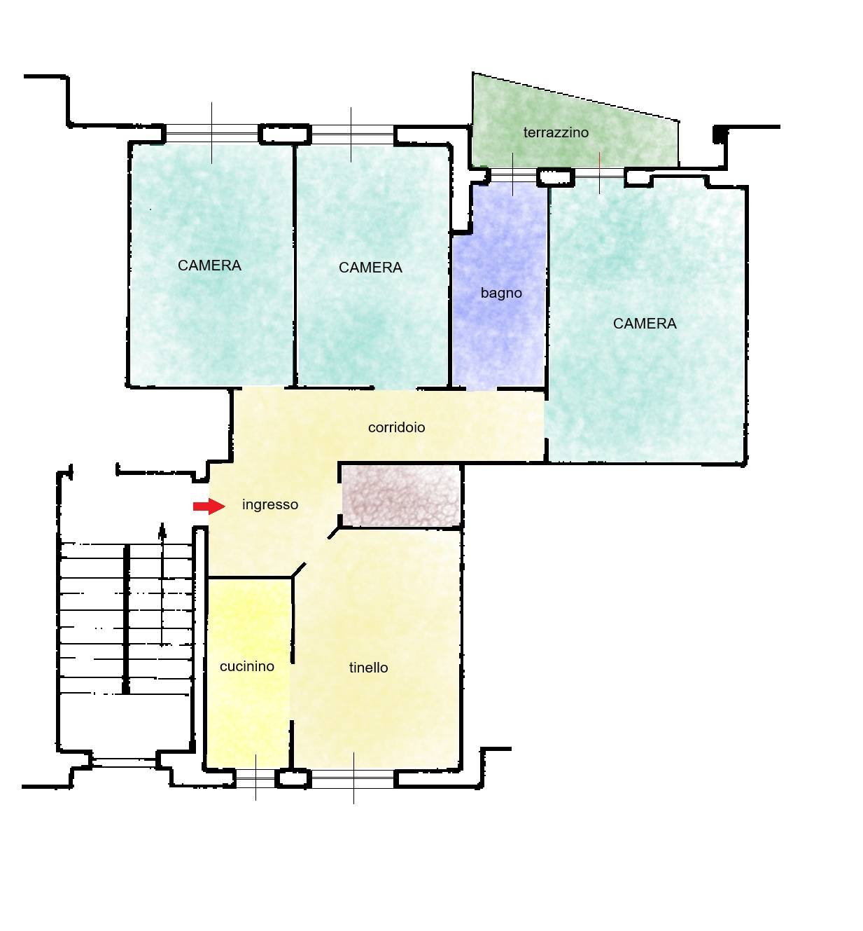 INTERNO: mq. 96 catastali. Appartamento in ordine. Pavimentazioni in graniglia. Ogni vano è dotato di ampie finestre, a garantire un'ottima luminosità, in legno monovetro. Il riscaldamento è centralizzato contabilizzato con termovalvole. L'appartamento offre spazi generosi, ideali per famiglie o per chi desidera ambienti separati.