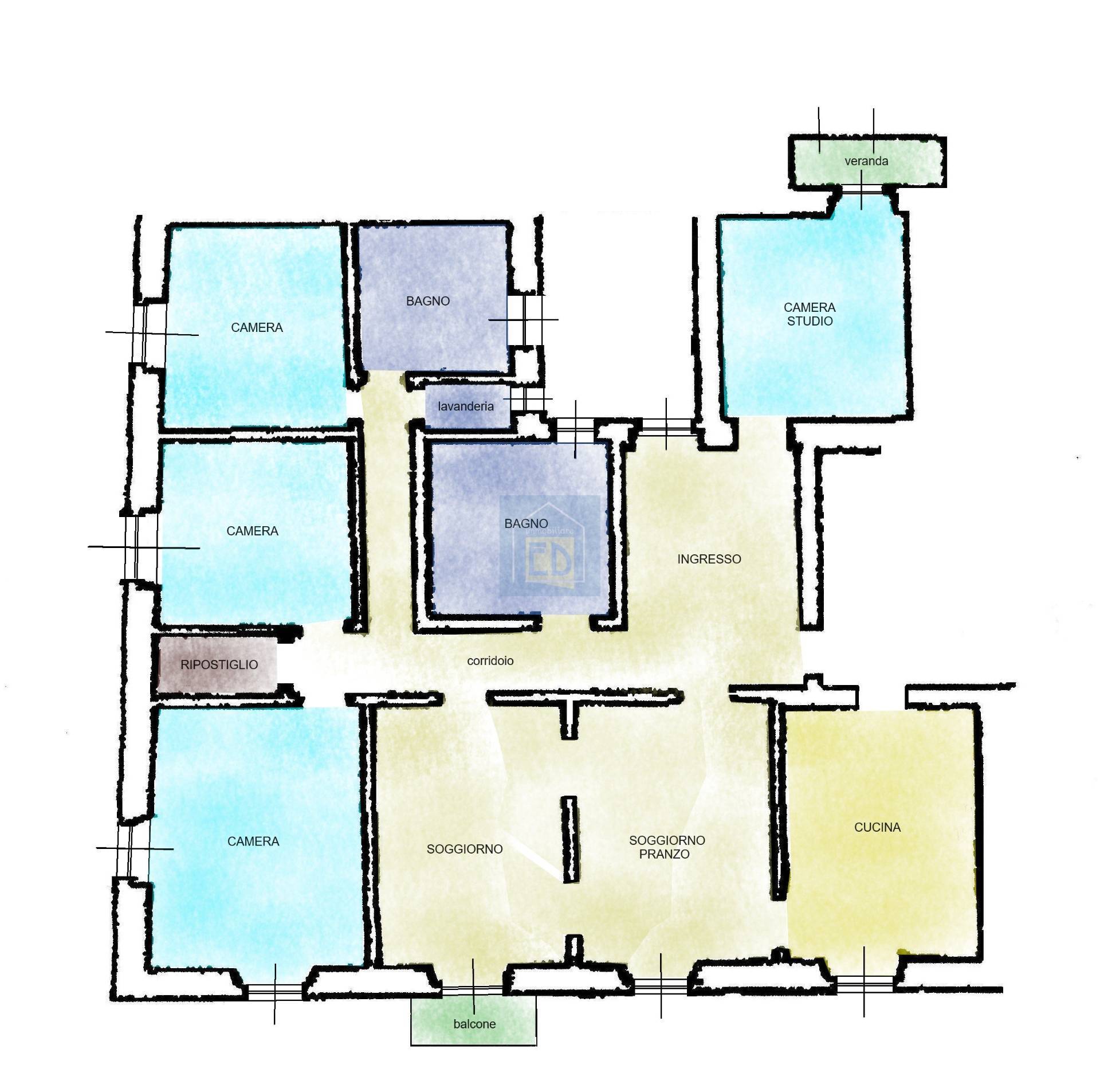 Appartamento in perfetto ordine, composto da ingresso, soggiorno, sala da pranzo, tre camere da letto, studio, cucina abitabile, due bagni, balcone, veranda, ripostiglio e lavanderia.