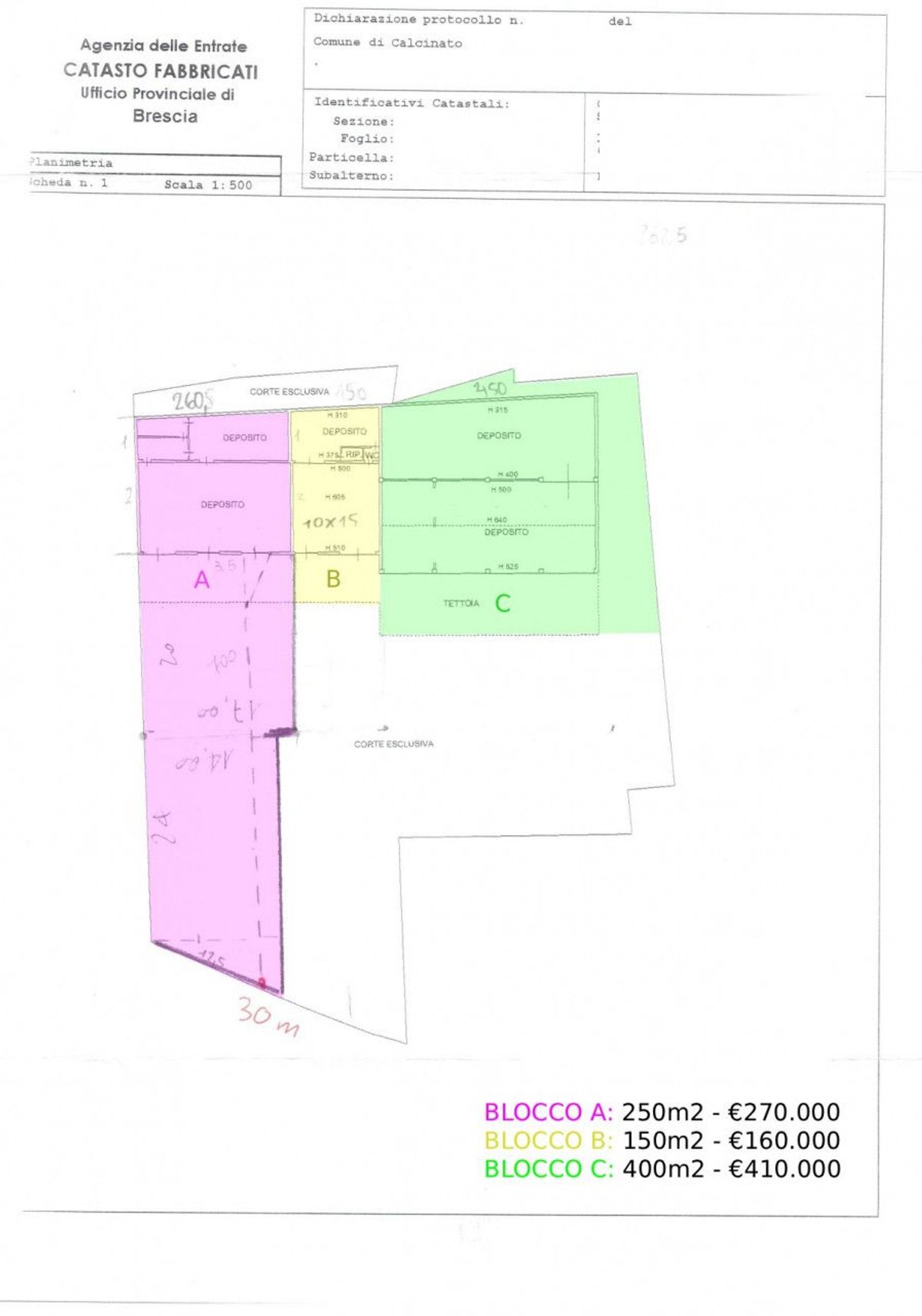 C) Ampio capannone fronte strada da circa 400mq con bagno interno e parte aperta frontalmente, accesso carraio comune – €410.000.