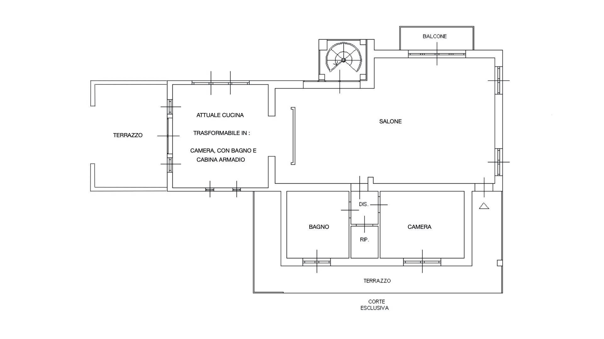 Una strategica quinta centrale separa la zona pranzo dalla cucina, splendida, grande e luminosa, finestrata sui tre lati e con un forno a legna ad altezza piano cottura. La parete di fronte allaccesso è in realtà tutta vetrata ed attraverso di essa si accede a un altro terrazzo per poi passare nel giardino.