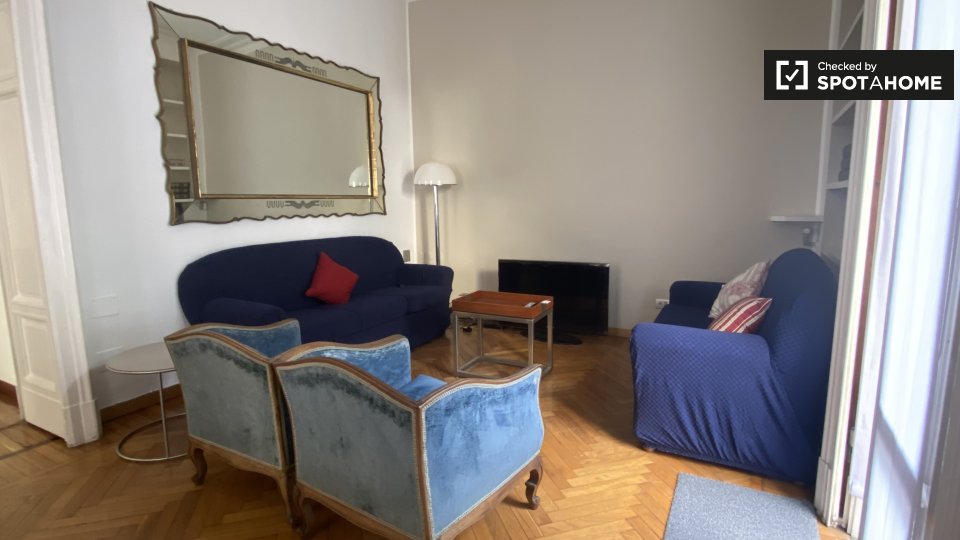 L’appartamento si trova al quarto piano di un elegante stabile con cortile interno. L’ingresso è caratterizzato da un bel terrazzino nel quale si potrà godere di un po’ d’aria fresca e di un gustoso bicchiere di vino. Superato il terrazzo si entra nel bellissimo bilocale: colori sobri ed un arredamento semplice ed elegante vi accoglieranno a braccia aperte. Sulla destra, in fondo al corridoio, sorge il soggiorno luminoso. Il divano, di un blu intenso, vi catturerà e ci si potrà rilassare mentre si guarda un film nel televisore presente nella sala. La cucina è attrezzata dei principali comfort, inoltre, è presente un tavolo dove sarà possibile gustare degli ottimi pasti. La finestra presente in cucina da’ al terrazzino dell’ingresso, rendendo la stanza luminosa e accogliente.