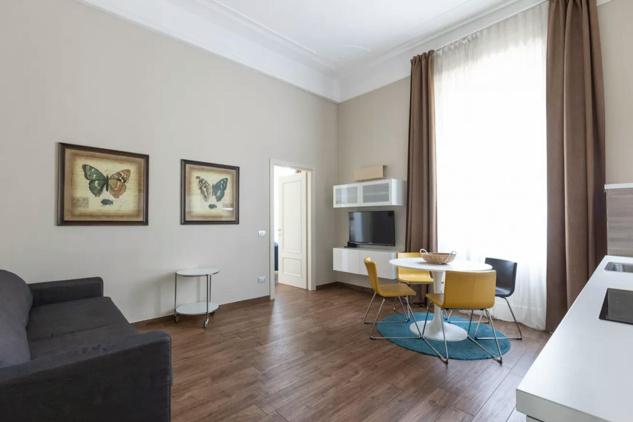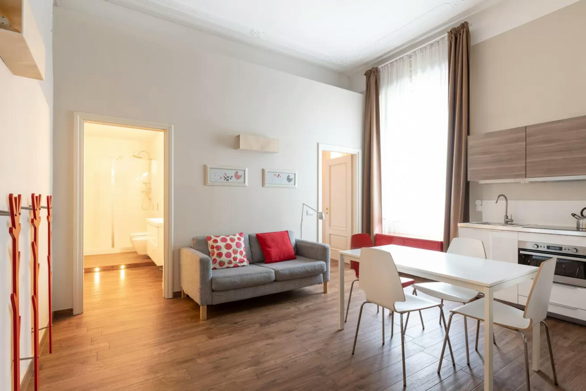 Upon entering you are greeted by the bright living room, furnished with a sofa that can be transformed into a double bed if necessary, a table with 4 chairs and a TV. The open kitchen is modern and equipped with a dishwasher, induction plates and all the utensils for lunch or dinner for 4 people. The modern furnishings, large windows and high ceilings typical of period buildings create a unique and refined environment. The bedroom with double bed, TV, wardrobe, also has a small desk where you can work from home in a separate room from the living area. The recently renovated bathroom has a shower cubicle, washing machine and sanitary ware.