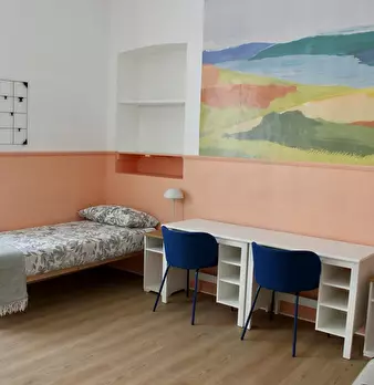Bed place in a shared room with 2 beds, in a modern, comfortable, colorful and full of design house, with a big kitchen, with oven, microwave, a large living room with sofa bed, smart tv led, bathrooms with jacuzzi shower and radio fm. Room with container bed, desk, wardrobe, shelves. All new and modern stuff. Fastweb wi-fi in all the house.