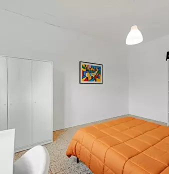 This bright and spacious room features a private bathroom, two wardrobes with drawers, a huge double bed (180x200cm) with night tables and a desk with drawers and chairs.