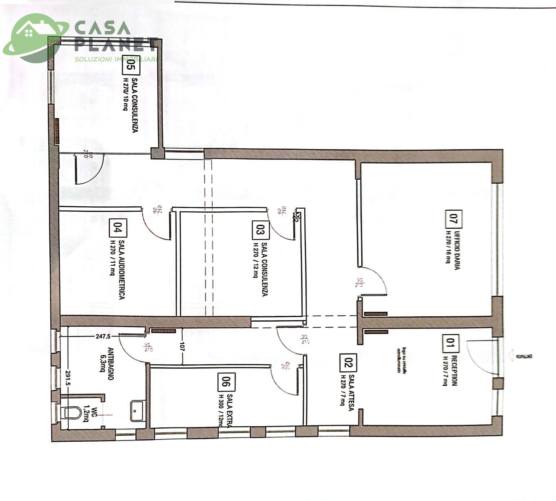L’immobile, situato al piano terra di un piccolo condominio, è composto da una zona reception, ufficio di 16 mq., sala d'attesa, sala consulenza di 12 mq., sala extra di 13 mq., altre due sale consulenza di 10 e 11 mq., antibagno e bagno.