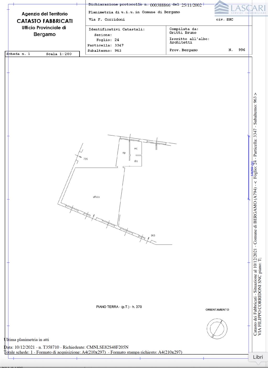 Posizione strategica per la vicinanza del Rondò delle Valli con rapidi collegamenti alla viabilità principale, alle linee tramviarie TEB e TEB 2 in corso di ultimazione. Nel complesso commerciale Esselunga di Via Corridoni, ufficio di buona immagine di mq. 92 con 3 vetrine suddiviso in tre spazi con pareti mobili con ampio bagno e ripostiglio. L'ufficio è dotato di impianto elettrico, controsoffitto con corpi illuminanti, rete dati, impianto di riscaldamento/raffrescamento centralizzato con gestione autonoma e trattamento aria primaria. Spese condominiali inclusi consumi riscaldamento/raffrescamento € 3.518. Nel contesto vi è un' ampia disponibilità di parcheggio ad uso pubblico. Possibilità di abbinare un box auto. In adiacenza è disponibile un altro ufficio con 2 vetrine di mq. 111 subito disponibile per una superficie complessiva di mq. 203. Locazione diretta senza provvigioni.